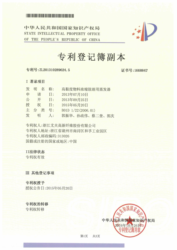 • 高黏度物料濃縮脫溶用蒸發器 受讓專利登記簿