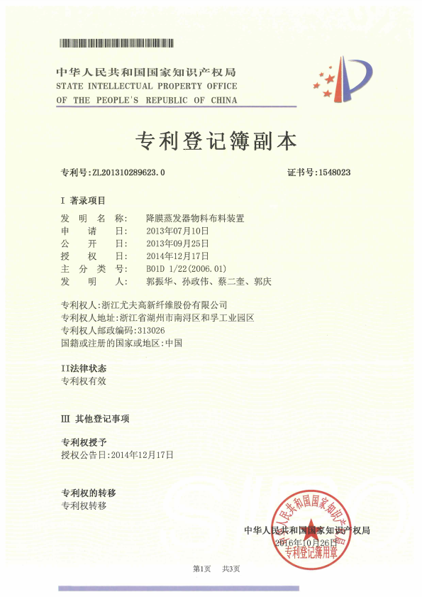 • 降膜蒸發(fā)器物料布料裝置 受讓專利登記簿